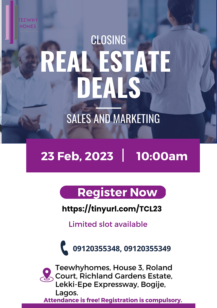 CLOSING REAL ESTATE DEALS Teewhyhomes Consulting Limited invites you to a-day training on Closing Real Estate Deals Venue: Teewhyhomes, House 3, Roland Court, Richland Gardens Estate, Lekki-Epe Expressway, Bogije, Lagos State, Nigeria. Time: 10:00 AM Prompt There will be gifts for the first ten people to arrive at the venue. A limited slot is available. Registration link:...