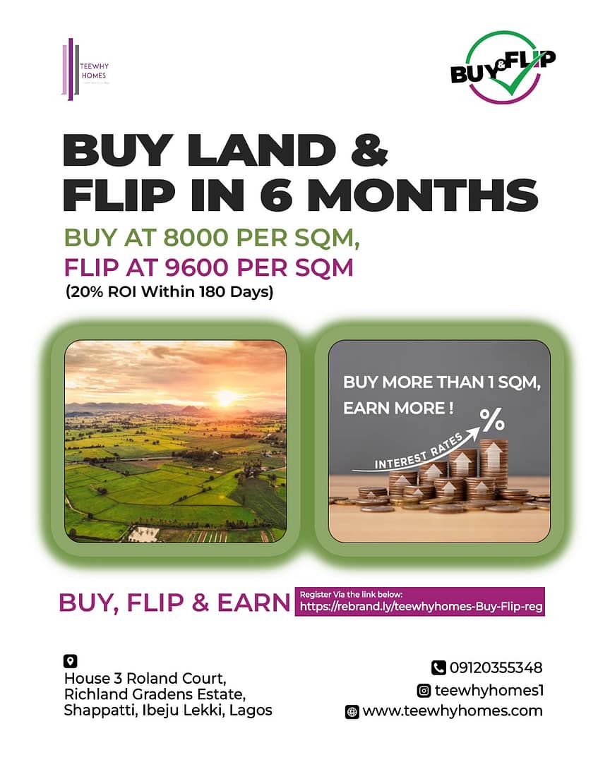 Don\’t miss out on this chance to transform your financial landscape. BUY, FLIP & EARN with TEEWHYHOMES CONSULTING LIMITED.